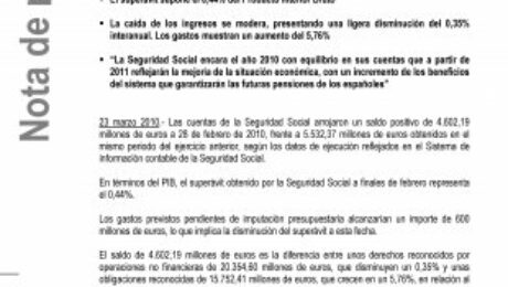 Segun Octavio Granado, secretario de Estado de la Seguridad Social: como todos los anos, la Seguridad Social ha colgado su ejecucion presupuestaria de los dos primeros meses de 2010. Al igual que los anos 2009 y 2008 se esta comprobando que las previsiones realizadas en el presupuesto de la Seguridad Social se estan cumpliendo. Hemos acabado el ano mas duro de la crisis, el ano 2009, con el mismo superavit que teniamos previsto en el presupuesto en los dos primeros meses del ejercicio de 2010, de hecho el superavit es ligeramente, muy ligerisimamente, pero superior al que habiamos previsto inicialmente en el presupuesto.
