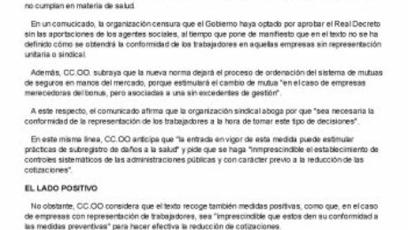 No obstante, CC.OO considera que el texto recoge también medidas positivas, como que, en el caso de empresas con representación de trabajadores, sea "imprescindible que estos den su conformidad a las medidas preventivas" para hacer efectiva la reducción de cotizaciones.