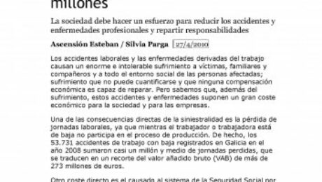 Una de las consecuencias directas de la siniestralidad es la pérdida de jornadas laborales, ya que mientras el trabajador o trabajadora está de baja no participa en el proceso de producción. De hecho, los 53.731 accidentes de trabajo con baja registrados en Galicia en el año 2008 sumaron casi un millón y medio de jornadas perdidas, que se traducen en un recorte del valor añadido bruto (VAB) de más de 273 millones de euros.
