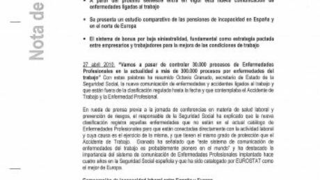 En rueda de prensa previa a la jornada de conferencias en materia de salud laboral y prevencion de riesgos, el responsable de la Seguridad Social ha explicado que la nueva clasificacion registra aquellas enfermedades que no estan en el actual catalogo de Enfermedades Profesionales pero que estan conectadas directamente con la actividad laboral y cuya causa es el ejercicio de la misma, y que tienen el mismo grado de proteccion que el Accidente de Trabajo. Granado ha senalado que este sistema de comunicacion de enfermedades del trabajo es probablemente pionero en el mundo y ha destacado la importancia del sistema de comunicacion de Enfermedades Profesionales implantado hace cuatro anos en la Seguridad Social espanola y que ha sido catalogado por EUROSTAT como el mejor de Europa.