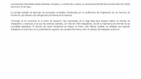Torrevieja se ha convertido en el punto de actuacion mas importantes de la Vega Baja para Asepeyo debido al volumen de trabajadores y empresas a las que da cobertura sanitaria, con mas de 5.000 trabajadores, de ahi la importancia de informar de las novedades legislativas. El director del centro Asistencial de Asepyo en Elche, Juan Manuel Candela, ha senalado que seguiran trabajando en esta linea con la posibilidad de organizar otra jornada informativa, sobre el estatuto del trabajador autonomo.