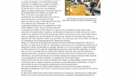El caso de Leon no iba a ser una excepcion. Segun los datos ofrecidos por el Instituto Nacional de la Seguridad Social (INSS), duranteel ano 2007 se iniciaron una media de 5.596 expedientes de incapacidad temporal en toda la provincia de Leon, lo que arroja un total de55.152 casos al ano. Al ano siguiente las cifras se mantenian casi inalterables con un casi inapreciable descenso de 612 expedientes en todo 2008 respecto a 2007. Pero el punto de inflexion se produjo entre 2008 y 2009, fecha en la que la crisis se adueno de todo el panorama economico. El pasado ano se registro una media de 531 bajas menos cada mes que en el ano anterior con total de 6.372 menos que en todo 2008 y, por primera vez en varios anos situo el total por debajo de los 50.000 partes, 48.168 para ser exactos. Porcentualmente supone un descenso del 13% respecto a 2008. Hay que tener en cuenta que, como se ha dicho, se trata de los expedientes de incapacidad temporal legalmente incoados.