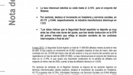 – Los datos indican que la Seguridad Social espanola va dejando ya muy atras las cifras mas duras del ajuste, que han tenido traduccion en la EPA del primer trimestre que refleja el escalon navideno de los contratos interrumpidos a final de ano