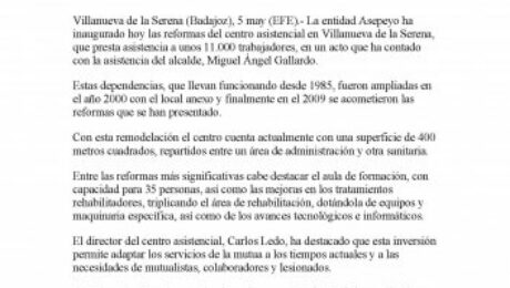 Esta nueva instalacion se completa con los centros asistenciales de Badajoz y Caceres, y con la puesta en marcha de la nueva oficina en Merida, que se inaugurara manana jueves.