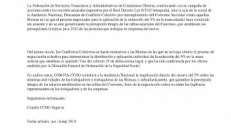 La Federación de Servicios Financieros y Administrativos de Comisiones Obreras, continuando con su campaña de acciones contra los recortes salariales impuestos por el Real Decreto Ley 8/2010 interpodrá, ante la sala de lo social de la Audiencia Nacional, Demandas de Conflicto Colectivo por incumplimiento del Convenio Sectorial contra aquellas Mutuas en las que el proceso negociador para la aplicación de la reducción del 5% en la masa salarial haya concluido sin acuerdo y no se esté garantizando la percepción íntegra de las tablas salariales del Convenio, que establecen las percepciones mínimas para 2010 de las personas que trabajan en empresas del sector.