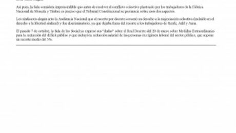 Así pues, la Sala considera imprescindible que antes de resolver el conflicto colectivo planteado por los trabajadores de la Fábrica Nacional de Moneda y Timbre es preciso que el Tribunal Constitucional se pronuncie sobre esos dos aspectos.