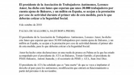 ATA espera que unos 30.000 autonomos de Baleares se acojan al paro para trabajadores por cuenta ajena en el primer ano