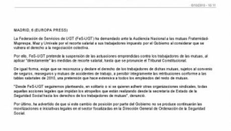 La Federación de Servicios de UGT (FeS-UGT) ha demandado ante la Audiencia Nacional a las mutuas Fraternidad-Muprespa, Maz y Umivale por el recorte salarial a sus trabajadores impuesto por el Gobierno al considerar que se vulnera el derecho a la negociación colectiva.