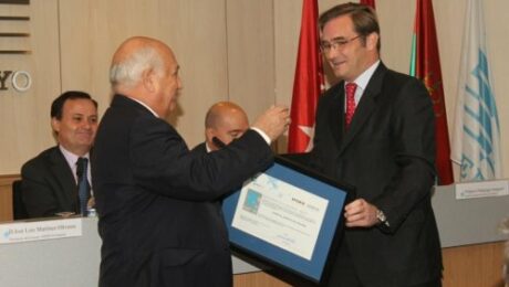 En la fotografía, Ignacio Olalquiaga, director de la delegación de AENOR, hace entrega del certificado a José Luis Martínez Olivares, presidente del Consejo Regional de Asepeyo Madrid.