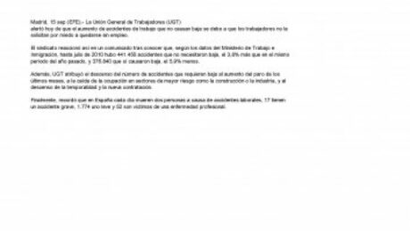 La Unión General de Trabajadores (UGT) alertó hoy de que el aumento de accidentes de trabajo que no causan baja se debe a que los trabajadores no la solicitan por miedo a quedarse sin empleo.