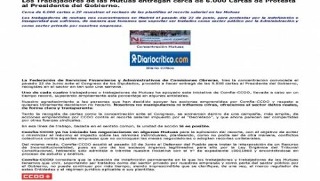 Comfia-CCOO ya ha iniciado las negociaciones en algunas Mutuas para la aplicación del recorte, con el objetivo de evitar o minimizar al máximo el impacto sobre las nóminas individuales, planteando, como no podía ser de otra manera, conflictos colectivos contra aquellas empresas que no convoquen las mesas negociadoras o adopten recortes unilaterales.