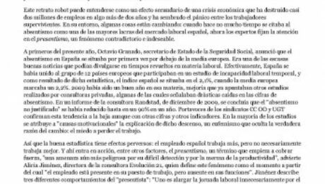 A primeros del presente año, Octavio Granado, secretario de Estado de la Seguridad Social, anunció que el absentismo en España se situaba por primera vez por debajo de la media europea. Era una de las escasas buenas noticias que podían divulgarse en tiempos revueltos en materia laboral. Efectivamente, España se había unido al grupo de 12 países europeos que participaban en un estudio de incapacidad laboral temporal, y como resultado de dicha estadística, el índice español se situaba en el 2,1%, cuando la media europea marcaba un 2,2%. 2009 había sido un buen año en esa materia, mejoría que ya apuntaban otros estudios realizados por consultoras privadas, algunas de las cuales señalaban drásticas caídas en las cifras de absentismo. En un informe de la consultora Randstad, de diciembre de 2009, se concluía que el "absentismo no justificado" se había reducido hasta en un 90% en un año. Portavoces de los sindicatos CC OO y UGT confirman esta tendencia a la baja aunque con otras cifras y otros indicadores. En la mayoría de los estudios se atribuye a "causas motivacionales" la explicación de dicho descenso, un eufemismo que oculta la verdadera razón del cambio: el miedo a perder el trabajo.
