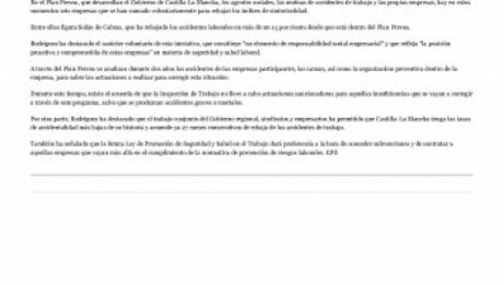 Por otra parte, Rodríguez ha destacado que el trabajo conjunto del Gobierno regional, sindicatos y empresarios ha permitido que Castilla-La Mancha tenga las tasas de accidentalidad más bajas de su historia y acumule ya 27 meses consecutivos de rebaja de los accidentes de trabajo.