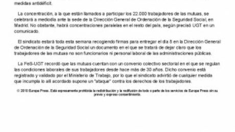 Las secciones sindicales de las mutuas de accidentes de trabajo de la Federación de Servicios de UGT (FeS-UGT) han convocado una concentración para el próximo día 8, día de la huelga general en el sector público, en protesta por los recortes salariales impuestos por el Gobierno en el decreto de medidas antidéficit.
