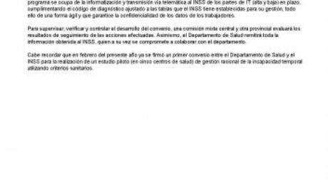Cabe recordar que en febrero del presente ano ya se firmo un primer convenio entre el Departamento de Salud y el INSS para la realizacion de un estudio piloto (en cinco centros de salud) de gestion racional de la incapacidad temporal utilizando criterios sanitarios.