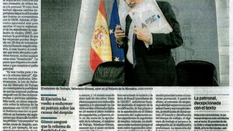 En relación a la negociación suspendida con los sindicatos, Gay de Montellà ha asegurado que "no es un fracaso, es una ocasión perdida" y ha denunciado: "Algo debe pasar para que los únicos que hemos reaccionado al anteproyecto de ley seamos los empresarios, no los sindicatos", a quien asegura que la reforma propuesta por el Gobierno beneficia claramente.