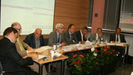 PIE DE FOTO: De izquierda a derecha: Miquel Benabarre, Secretario General; Fernando García, Asesor de Presidencia; Josep Maria Montañola, Vicepresidente Tercero; Miquel Àngel Puig, Director Gerente; José Domingo Valls, Presidente; Javier Artal, Vicepresidente Segundo; Josep Noguès, Asesor de Presidencia, y Ferran Plana, Subdirector General.