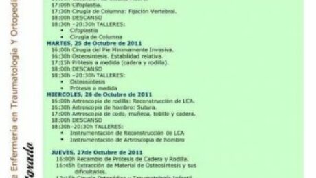 Este curso, dirigido al sector de enfermería y específico de Traumatología, ha sido organizado por la Asociación Española de Enfermería en Traumatología y Ortopedia (AEETO). Cada año se realizan dos cursos: uno básico y otro avanzado, teniendo carácter anual y siendo impartido a nivel nacional. Su primera edición fue en 2006 y desde el año siguiente participa en él nuestra Supervisora de Quirófano, Margarita Moreno.