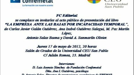El próximo jueves 17 de mayo de 2012 se presenta en la Universidad CEU San Pablo en Madrid el libro La empresa ante las bajas por incapacidad temporal, una obra colectiva publicada por FC Editorial, que aborda esta materia desde un enfoque práctico y multidisciplinar. El trabajo ha sido coordinado por el abogado Carlos Javier Galán y junto a él son coautores la psicóloga Ana Isabel Gutiérrez, la abogada y profesora M. Paz Martín, el director de prestaciones económicas de FREMAP, Antonio Salas, y el detective privado David Sanmartín. El acto público de presentación dará comienzo a las 20 horas, en el Salón de Grados de la Universidad, calle Julián Romea núm. 23.