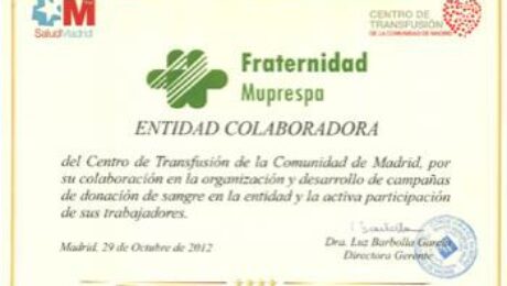 Fraternidad Muprespa ha recibido del certificado como Entidad Colaborada del Centro de Transfusiones de la Comunidad de Madrid. Los empleados de los centros de trabajo de la mutua ubicados en el barrio de las letras han participado voluntariamente en una jornada de donacion de sangre.
