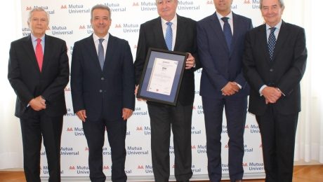 Jaime Aguirre de Cárcer y Moreno, presidente de Mutua Universal; Juan Güell, director gerente de la Entidad; y José Luis Haurie Vigne, presidente del Comité de Auditoría y Cumplimiento de Mutua Universal, fueron los encargados de recoger el certificado de manos de Ángel Luis Sánchez, director de la Región Mediterránea de AENOR y Jordi Martin, director de AENOR Cataluña, durante un acto oficial celebrado en las sede de Mutua Universal en Barcelona.