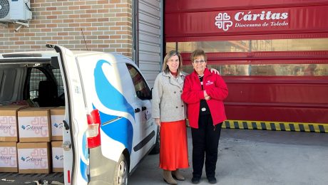 Alicia Pérez, directora de Recursos Humanos de la mutua ha hecho entrega de lo recogido a Marisa Martínez, coordinadora del centro diocesano de distribución “Virgen del Sagrario” de Cáritas Diocesana, en las instalaciones que posee esta institución en el barrio de Santa María de Benquerencia.