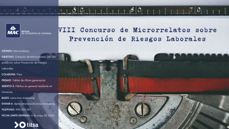 Por su parte, el VIII Concurso de Microrrelatos sobre Prevención de Riesgos Laborales invita a la ciudadanía a reflexionar sobre la cultura preventiva a través de textos breves de entre 50 y 150 palabras. Este certamen está abierto a todas las personas mayores de edad que residen en Canarias, con plazo de participación hasta el 4 de mayo de 2026. Los textos deben enviarse por correo electrónico a dptocomunicacion@mac-mutua.org e incluir un título, los datos personales y de contacto del autor o autora.