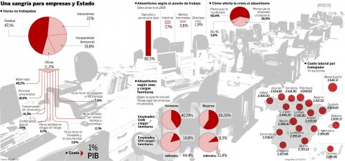 Además, según un estudio de Adecco, para el 59,26% de las empresas encuestadas, son las mujeres con cargas familiares las que más faltan a su puesto de trabajo, frente al 40,74% de los hombres con una situación similar. Sin embargo, libres de responsabilidades familiares, el absentismo laboral es mayor entre los hombres (14,8%), que entre las mujeres (9,3%). El informe también subraya que la media española, de un 5,35%, es superior a la europea, cifrada en un 4%. Y no parece que tales empresas contemplen el efecto de la crisis, porque un 60,4% considera que no ha tenido repercusión alguna. Entre los que sí consideran que la recesión ha tenido un efecto disuasorio sobre el absentismo, la sensación es que el miedo a perder el trabajo es el que más ha contribuido a reducir las ausencias innecesarias del puesto de trabajo.