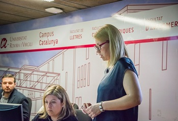 Las supervisoras de planta y quirofano de Clinica Activa, las enfermeras Teresa Escoda y Vanessa Gatell, respectivamente, describieron las necesidades laborales que precisa una mutua colaboradora de la Seguridad Social relacionadas con el colectivo profesional de enfermeria, en la Jornada de Insercion Laboral que organizo la Facultad de Enfermeria de la Universitat Rovira i Virgili de Tarragona con motivo del dia internacional de esta profesion, celebrado este jueves 10 de mayo de 2018.