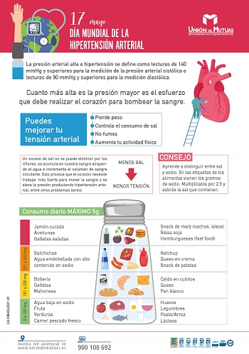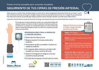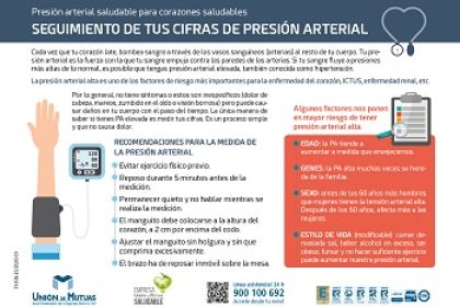 Con este objetivo, Unión de Mutuas para mantener unos corazones saludables ha elaborado unas infografías con pautas no farmacológicas para prevenir o, en su caso, aliviar la hipertensión basadas en un estilo de vida saludable. Asimismo, las infografías facilitan la realización correcta del seguimiento de la presión arterial, que debe de hacerse de forma periódica, siempre en la misma franja horaria y apuntando los valores arteriales.
