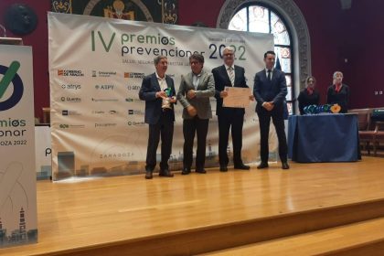 Ricardo Alfaro, Subdirector General de Medios de Asepeyo, y Santos Huertas, Director del Área de Innovación e Investigación de la Dirección de Prevención de Asepeyo, han recogido el premio en el acto de entrega, celebrado hoy en el Paraninfo de la Universidad de Zaragoza. Una gala que ha contado con la presencia de más de 500 profesionales y directivos de empresas del sector de la prevención de riesgos laborales.