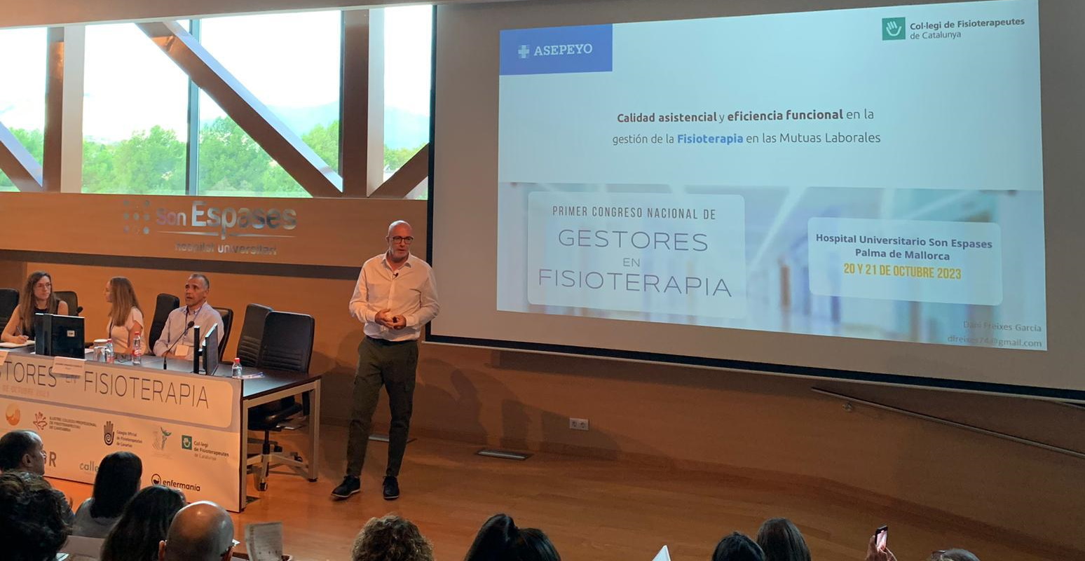En el marco de este congreso, Dani Freixes, director del área de Fisioterapia de Asepeyo, ha realizado la ponencia Calidad asistencial y eficiencia funcional en la gestión de la fisioterapia de las mutuas laborales, en la que ha presentado el modelo de gestión de Fisioterapia implantado en la Mutua.
