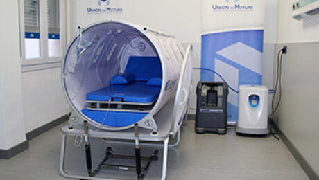 Fuente: UNION DE MUTUAS Mediante la camara hiperbarica se incrementa el oxigeno en sangre y se agilizan los procesos de recuperacion de los pacientes Unión de Mutuas acaba de poner en marcha, en su centro hospitalario de Castellón, la Unidad de Medicina Hiperbárica, una terapia no invasiva, sin efectos secundarios, por el que los pacientes,