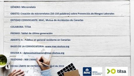 Fuente: MAC La Mutua de Accidentes de Canarias (MAC), con el apoyo de la empresa de Transportes Interurbanos de Tenerife, SA (TITSA), lanza su primer concurso de microrrelatos sobre Prevencion de Riesgos Laborales. Esta acción se une a la ya puesta en marcha hace dos semanas y que este año alcanza su segunda edición: el