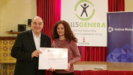 Fuente: Activa Mutua La delegada de Valls de Activa Mutua, Sara Paga, entrego el galardon a Joan Carles Sole, presidente del IMDL Vallsgenera. Activa Mutua, mutua colaboradora con la Seguridad Social número 3, ha galardonado al Instituto Municipal de Desarrollo Local (IMDL) Vallsgenera por la alta concienciación que demuestra a la hora de controlar y