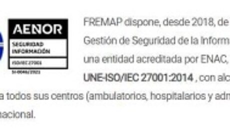 Fuente: FREMAP FREMAP ha renovado por un nuevo periodo de tres anos la acreditacion de Seguridad de la informacion en la norma internacional ISO 27001. El certificado, otorgado tras la auditoria realizada por AENOR, acredita que FREMAP tiene implantado un conjunto de controles adecuados para asegurar la confidencialidad, integridad y disponibilidad de su sistema de