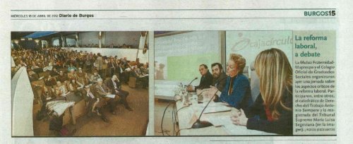 Nota de prensa publicada en el Diario de Burgos sobre la jornada informativa “Los Aspectos críticos del Real Decreto Ley 3/2012 de Medidas Urgentes para la Reforma del Mercado Laboral”, que Fraternidad Muprespa, junto con el Colegio Oficial de Graduados Sociales de Burgos, celebró el 17 de abril en la Caja Cículo de dicha localidad.