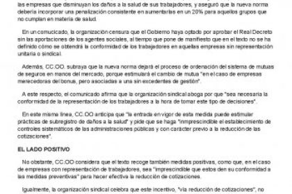 En este misma línea, CC.OO anticipa que "la entrada en vigor de esta medida puede estimular prácticas de subregistro de daños a la salud" y pide que se haga "imprescindible el establecimiento de controles sistemáticos de las administraciones públicas y con carácter previo a la reducción de las cotizaciones".