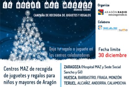 Un ano mas, queremos colaborar con esta iniciativa actuando como punto de recogida de juguetes y regalos. Para eso se han colocado cajas en 10 centros de MAZ en Aragon: Hospital de Zaragoza, Sede Social, Huesca, Barbastro, Fraga, Monzon, Teruel, Andorra, Alcaniz y Calamocha.