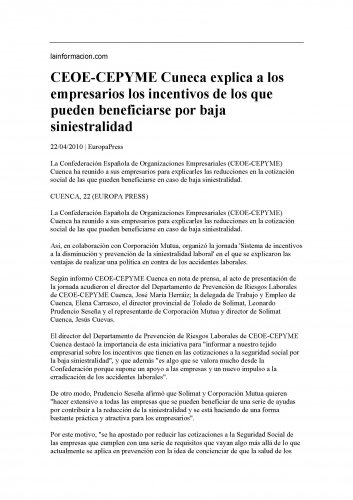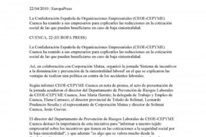 La Confederacion Espanola de Organizaciones Empresariales (CEOE-CEPYME) Cuenca ha reunido a sus empresarios para explicarles las reducciones en la cotizacion social de las que pueden beneficiarse en caso de baja siniestralidad.