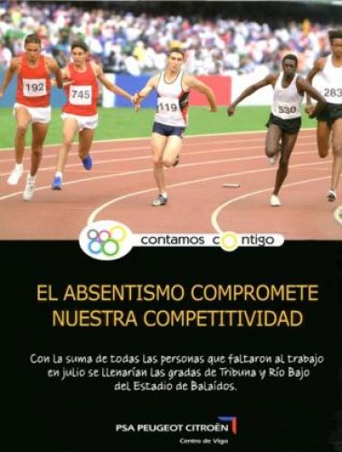 Vigo ha intensificado su lucha contra el absentismo laboral injustificado, cuyas cifras en Balaídos superan las de la media del sector de automoción en España. Esta campaña, que abarca desde módulos específicos para el personal de nuevo ingreso a comunicaciones colectivas o individualizadas, pancartas y carteles publicitarios (como el de la fotografía de la derecha), entre otros soportes, arrancó a comienzos de año y busca reducir las 500 bajas al mes que sufre la factoría, y que representan alrededor del 6% de la plantilla.