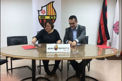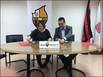 En la firma del convenio participaron Mónica Balsells, presidenta del Club Reus Deportivo y por parte de Activa Mutua, Ferran Pellisé, miembro del Comité Directivo de la entidad. (en la foto)