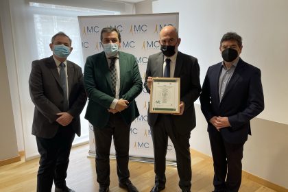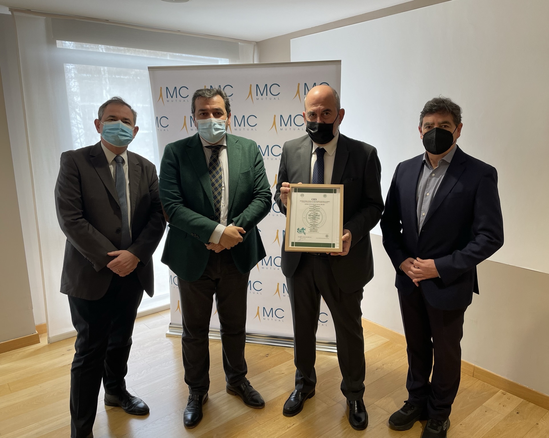 El acto de entrega de los reconocimientos ha tenido lugar en la sede central de MC MUTUAL en Barcelona y ha contado con la participación de Antonio Montaño, presidente del CIES; Manel Plana, director general de MC MUTUAL; Ángel Luis Martínez, director de la División Económico Financiera de MC MUTUAL y Javier Iruela, jefe del Departamento de Obras y locales de MC MUTUAL.