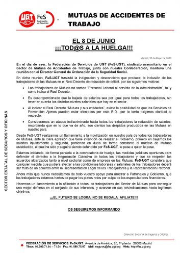 Desde FeS-UGT realizamos un llamamiento a la movilización en nuestro país de todos los trabajadores de Mutuas, ante la clara agresión que tiene intención de realizar el Gobierno, primero en bajarnos los salarios injustamente y segundo, poniendo en duda de forma constante el modelo de Mutuas establecido, el cual ha sido y seguirá siendo defendido por FeS-UGT, le pese a quien le pese.