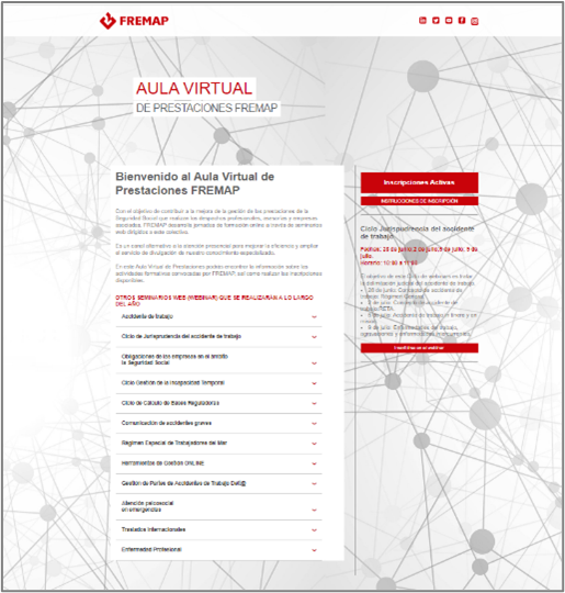 Con el objetivo de contribuir a la mejora de la gestión de las prestaciones de la Seguridad Social que realizan los despachos profesionales, asesorías y empresas asociadas, FREMAP ha desarrollado durante el mes de junio 9 jornadas de formación online a través de seminarios web con los siguientes títulos: