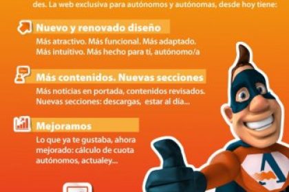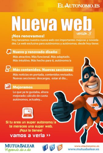Esta nueva versión de www.elautonomo.es (versión 3.0) supone un sustancial cambio de estética con una ampliación y mejora de contenidos con respecto a su predecesora, vigente desde el 2010. www.elautonomo.es se ha convertido en un referente para el colectivo por cuenta propia, en especial en el ámbito de la Mutuas de Accidentes de Trabajo.