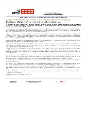 La Federación de Servicios Financieros y Administrativos de Comisiones Obreras solicitó, el pasado 10 de Junio al Defensor del Pueblo, la interposición de un recurso de inconstitucionalidad contra el Real Decreto Ley 8/2010, de 20 de Mayo, de conformidad con lo establecido en el artículo 162.1 a) de la Constitución, el artículo 32 de la Ley Orgánica 2/1979, del Tribunal Constitucional y los artículos 10 Uno y 29 de la Ley Orgánica 3/1981, del Defensor del Pueblo.