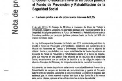 El Consejo de Ministros a propuesta del titular de Trabajo e Inmigración, Celestino Corbacho, ha acordado autorizar a la Tesorería General de la Seguridad Social para que invierta el Fondo de Prevención y Rehabilitación en activos financieros emitidos por personas jurídicas públicas hasta un límite del 90% del importe del citado fondo.