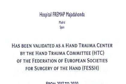 La Unidad de Cirugía de la Mano del Servicio de Cirugía Ortopédica y Traumatología del Hospital FREMAP de Majadahonda, está acreditado por el Hand Trauma Comitee de la Federación Europea de Cirugía de la Mano (FESSH) desde 2015, y este año ha sido reacreditada en el Congreso anual de la Sociedad con el Diploma of the European Board of Hand Surgery (EBHS).