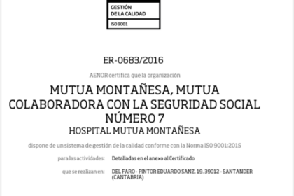 Mutua Montañesa, mutua colaboradora con la Seguridad Social número 7 y comprometida con la gestión fácil e innovadora de la salud laboral en sus empresas y con el cuidado de sus trabajadores protegidos, anuncia hoy la renovación del certificado de calidad ISO 9001:2015 en su Hospital Mutua Montañesa, situado en la ciudad de Santander.